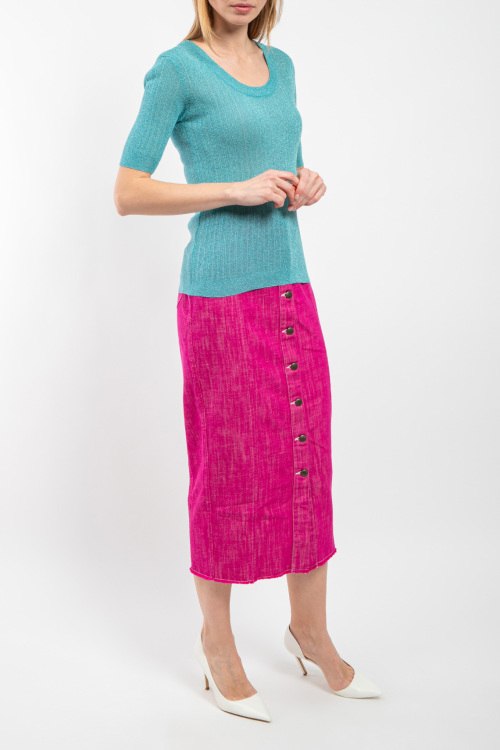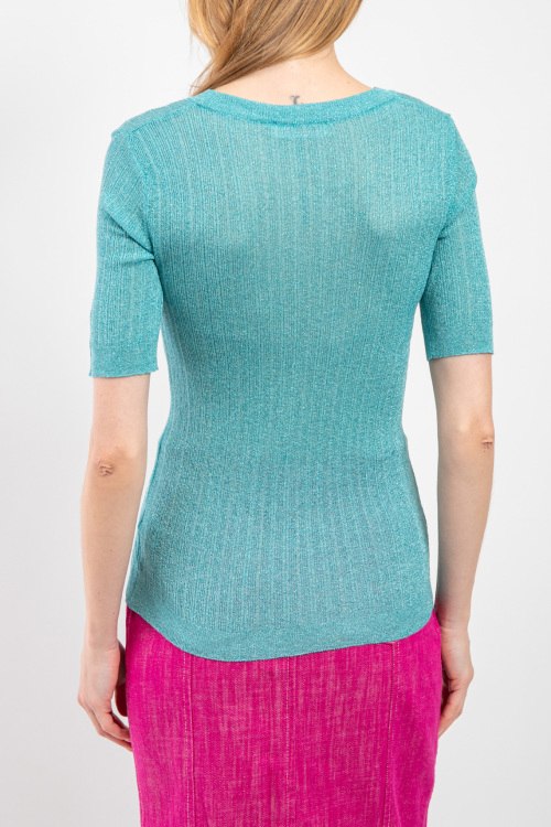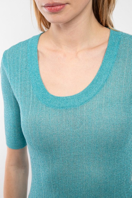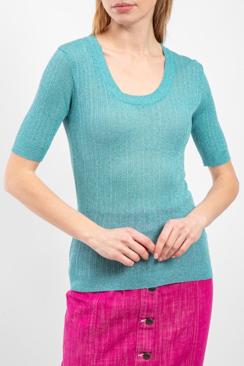 Женский бирюзовый трикотажный джемпер от Kontatto (Контатто). Модель с люрексом, круглый вырез горловины, короткий рукав, классическая длина. Замеры для размера UNI: длина: 58 см, ширина по груди: 36 см, ширина по талии: 33 см, длина рукава 15 см, ширина рукава: 10 см.