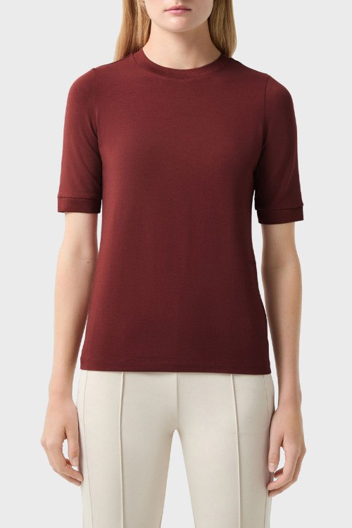 Детали: Женский бордовый джемпер из модала и хлопка Alexi от Bogner (Богнер). Круглый вырез горловины, короткий рукав, классическая длина