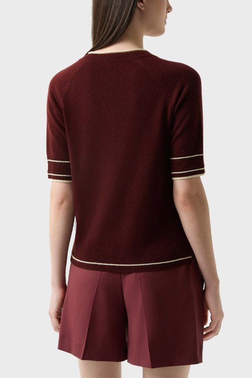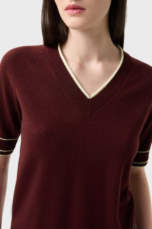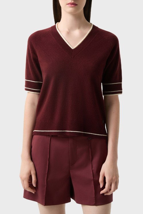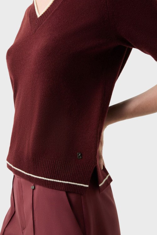 Детали: Женский бордовый пуловер из шерсти и кашемира Chiri от Bogner (Богнер). V-образный вырез, короткий рукав, контрастная окантовка, классическая длина