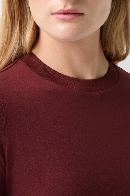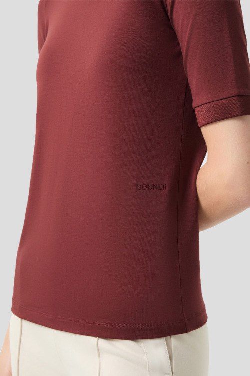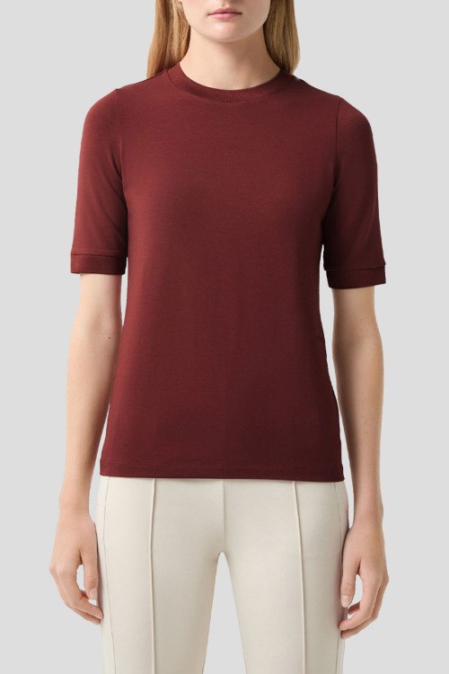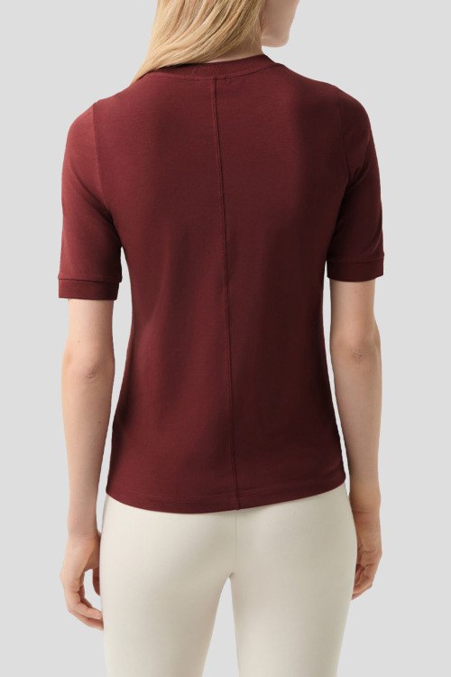 Детали: Женский бордовый джемпер из хлопка и модала Alexi от Bogner (Богнер). Вышитый логотип, круглый вырез горловины, короткий рукав, классическая длина