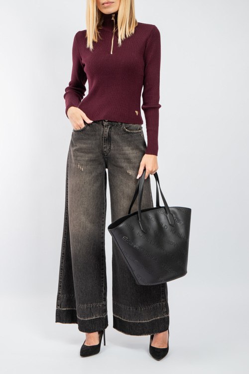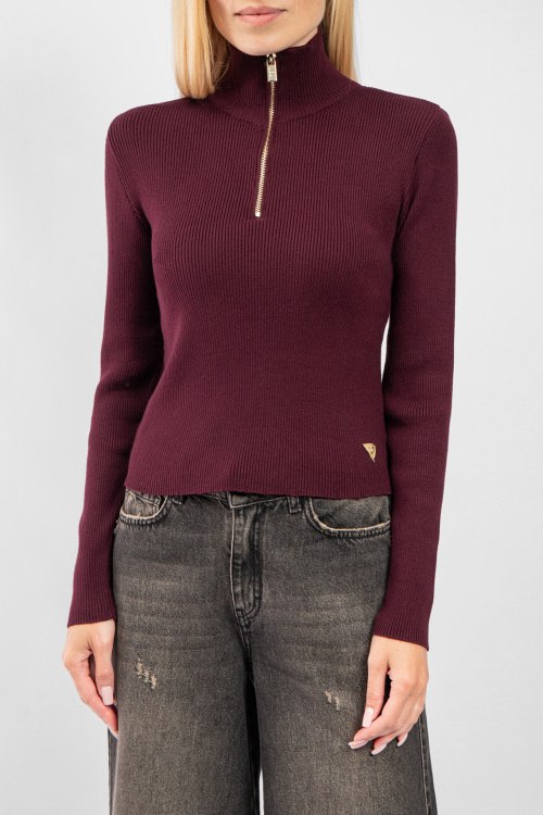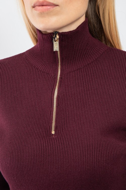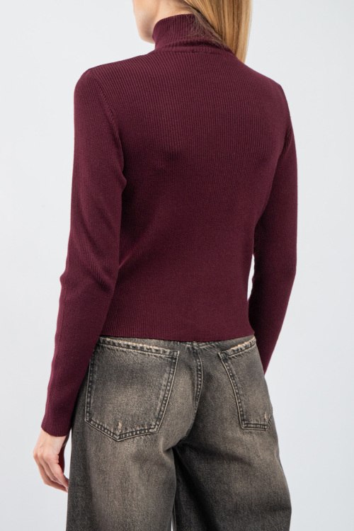 Женский бордовый джемпер из хлопка и вискозы от J.B4 Just Before (Джаст Бифо). Дизайн в рубчик, высокая горловина с застежкой на молнию, классическая длина.