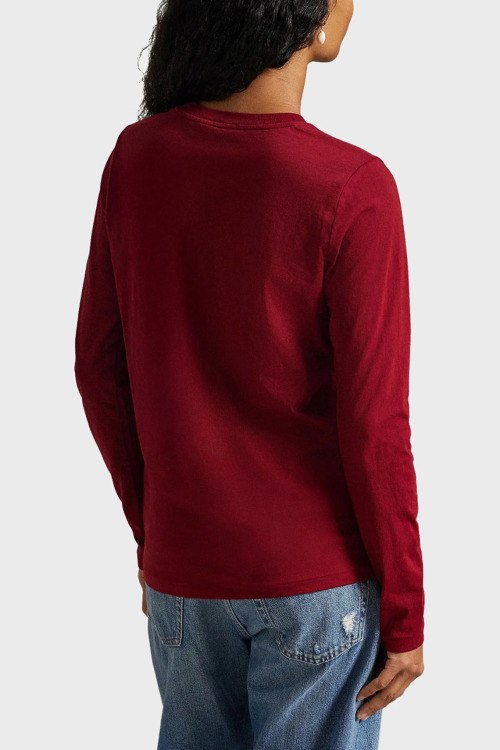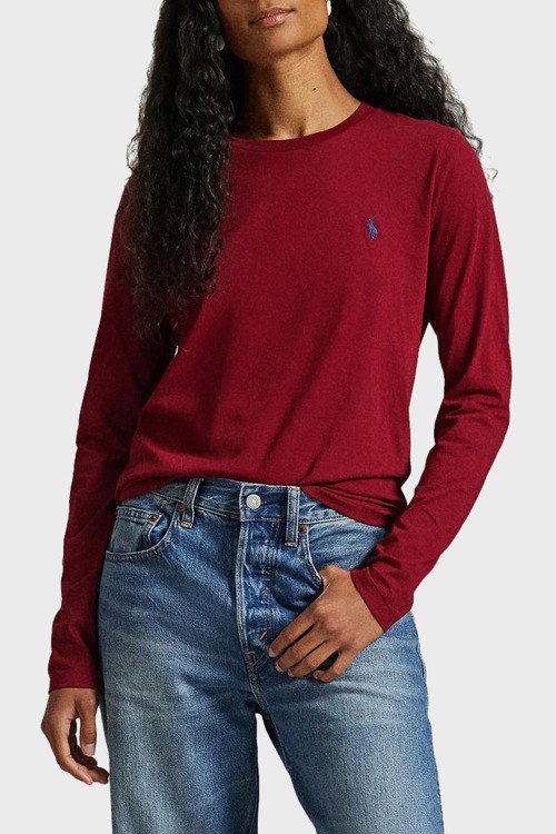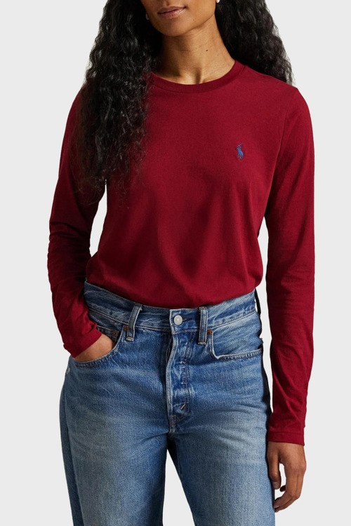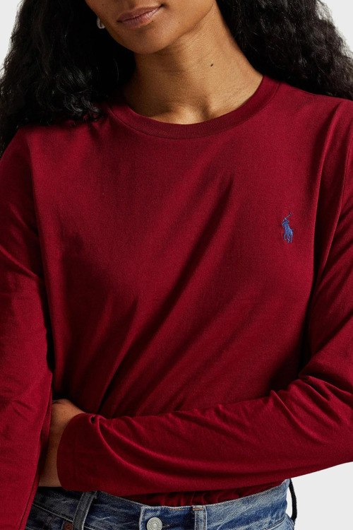 Детали: Женский бордовый лонгслив из хлопка от Polo Ralph Lauren (Поло Ральф Лорен). Классическая длина, круглый вырез горловины, длинные рукава, вышитый логотип бренда на груди