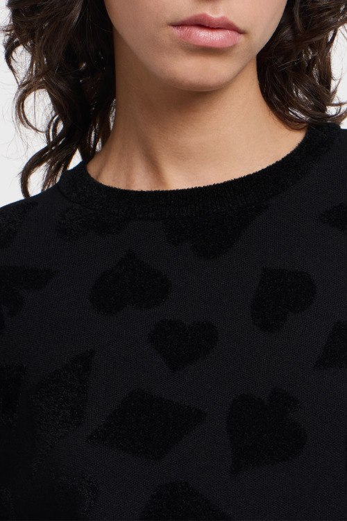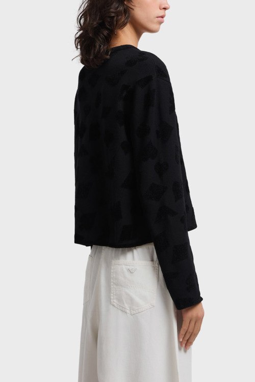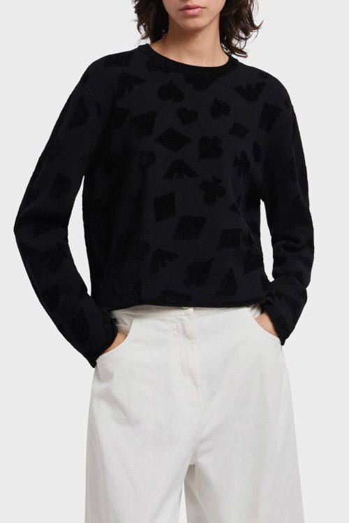 Детали: Женский черный джемпер из вискозного микса от Emporio Armani (Эмпорио Армани). Круглый вырез горловины, длинные рукава, дизайн с принтом