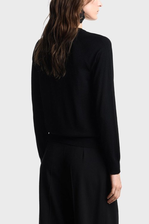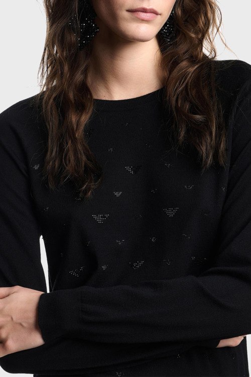 Детали: Женский черный шерстяной джемпер от Emporio Armani (Эмпорио Армани). Логотипы из кристаллов, круглый вырез горловины, классическая длина, манжеты и нижний край в рубчик