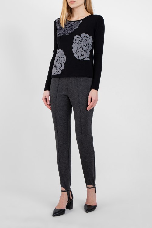 Женский черный джемпер с декором от Clips (Клипс). Средняя длина, длинные рукава, круглый вырез горловины, спереди декор из бахромы и принт, сзади завязывается на бант.
