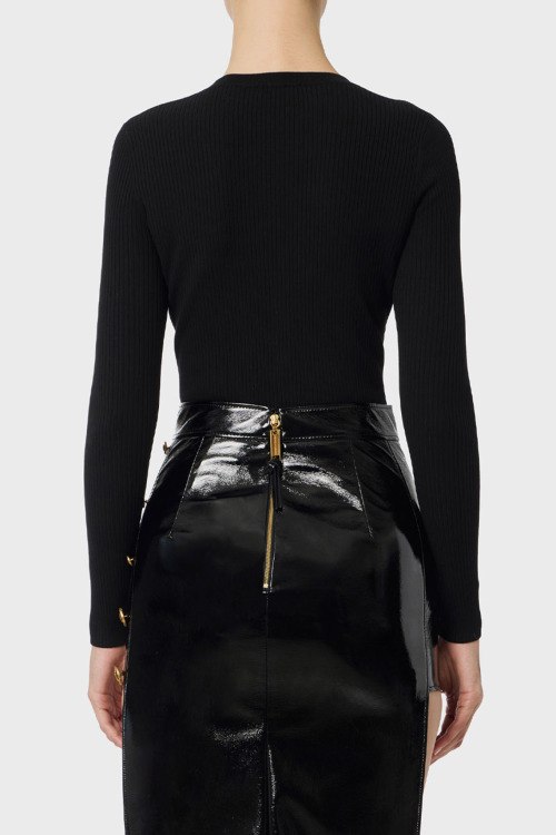 Детали: Женский черный трикотажный пуловер от Elisabetta Franchi (Елизабетта Франчи). Модель с примесью шелка, дизайн в рубчик, нагрудный карман с логотипом, V-образный вырез, застежка на пуговицы