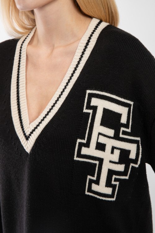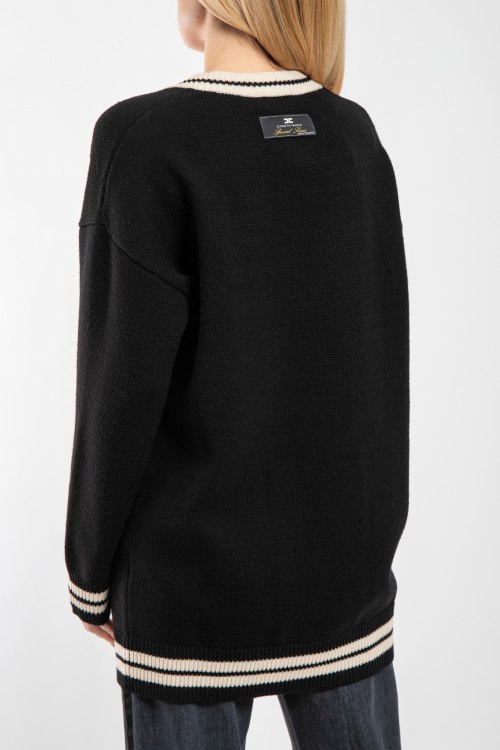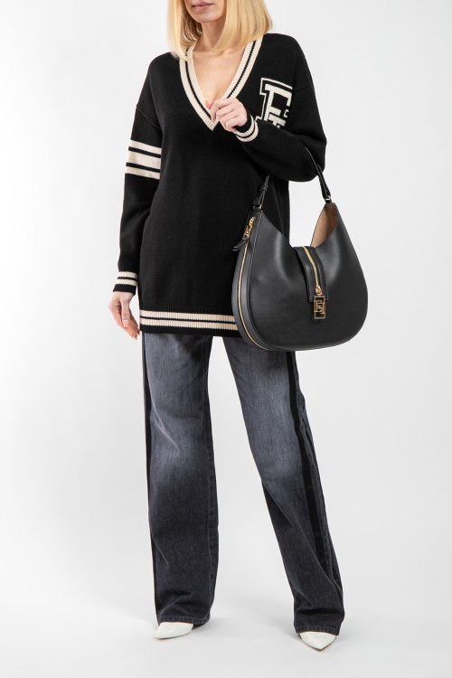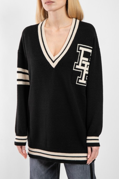 Женский черный шерстяной пуловер от Elisabetta Franchi (Елизабетта Франчи). Глубокий V-образный вырез, логотип на груди, фасон oversize, удлиненная длина.