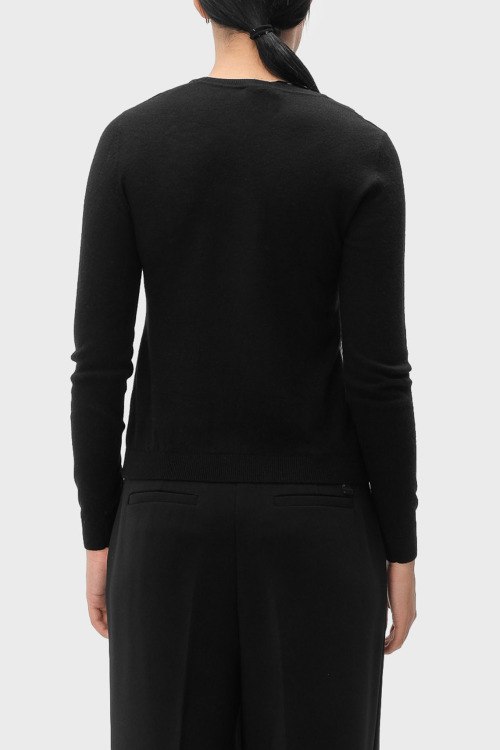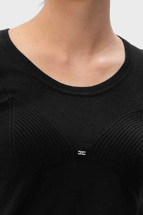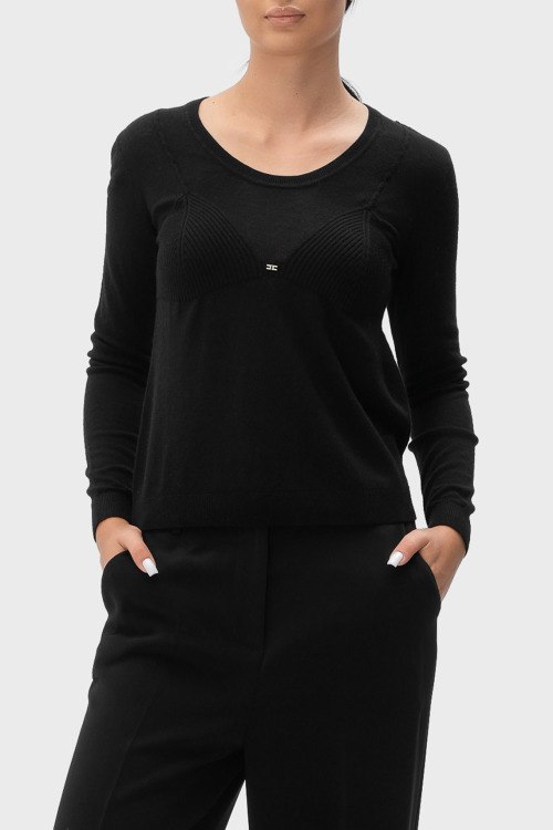 Детали: Женский черный шерстяной джемпер от Elisabetta Franchi (Елизабетта Франчи). Имитация лифа, значок логотипа, круглый вырез горловины, классическая длина