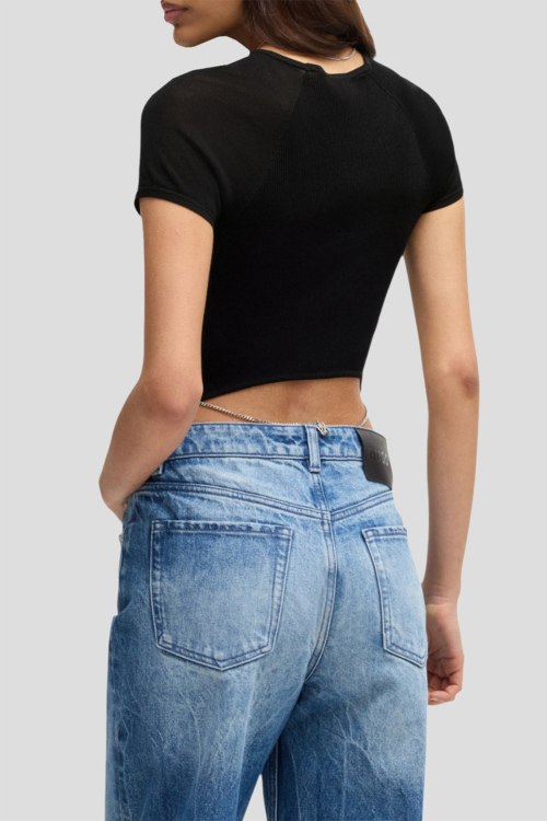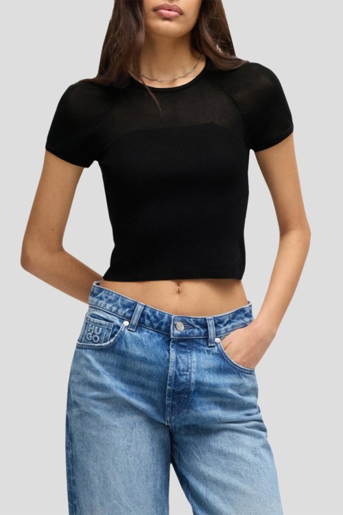 Детали: Женский черный трикотажный топ Slevetta от Hugo by Hugo Boss (Хуго бай Хуго Босс). Круглый вырез горловины, короткий рукав, декор цепочкой на спине, укороченная длина