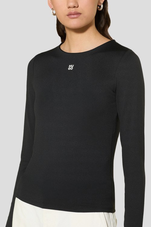 Детали: Женский черный лонгслив Dasiia от Hugo by Hugo Boss (Хуго бай Хуго Босс). Логотип на груди, круглый вырез горловины, классическая длина