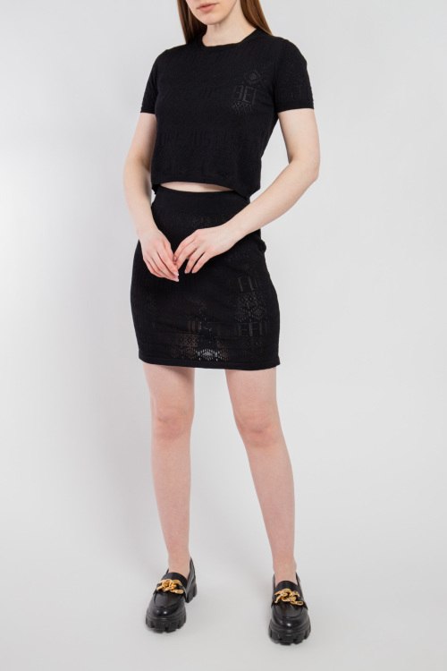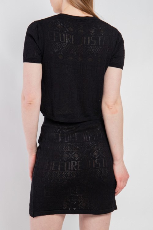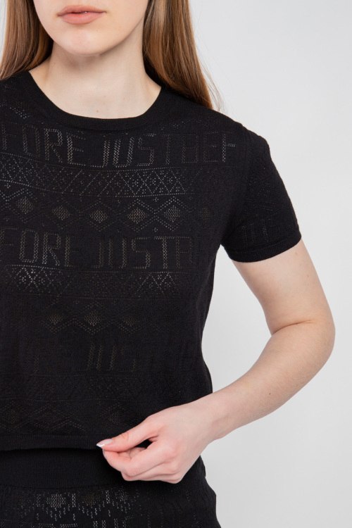 Женский черный хлопковый джемпер от J.B4 Just Before (Джаст Бифо). Тиснение логотипа по всей поверхности, круглый вырез горловины, короткий рукав, укороченная длина