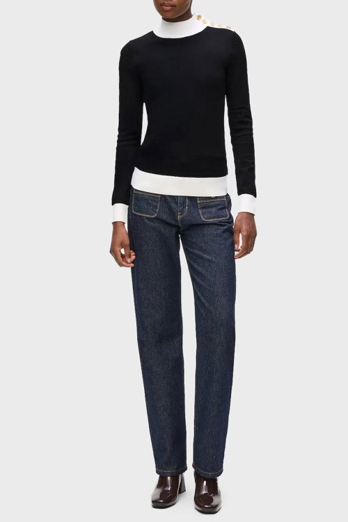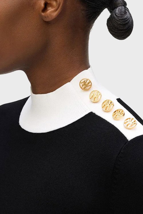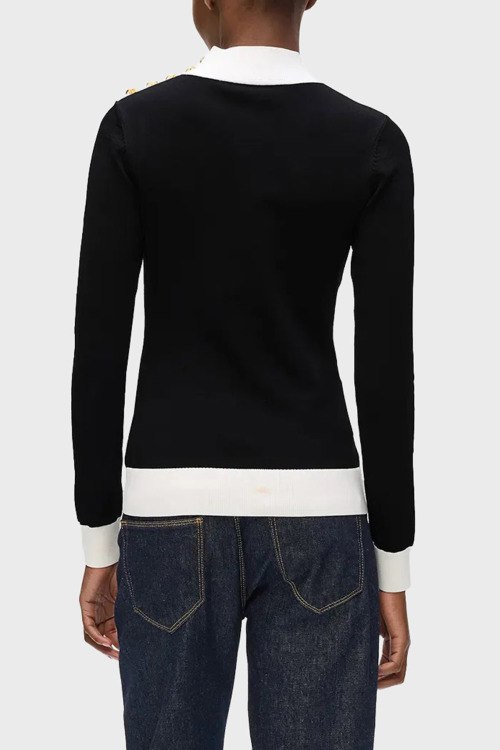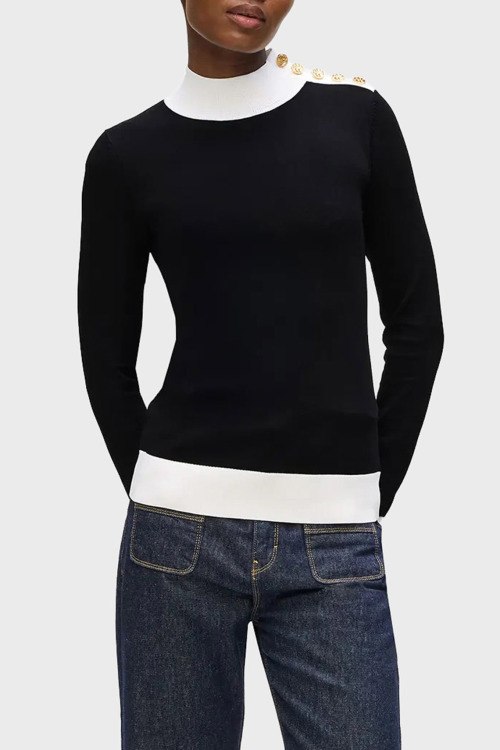 Детали: Женский черный трикотажный джемпер от Karl Lagerfeld (Карл Лагерфельд). Белые вставки, воротник-стойка, застежка на золотистые пуговицы на плече, классическая длина