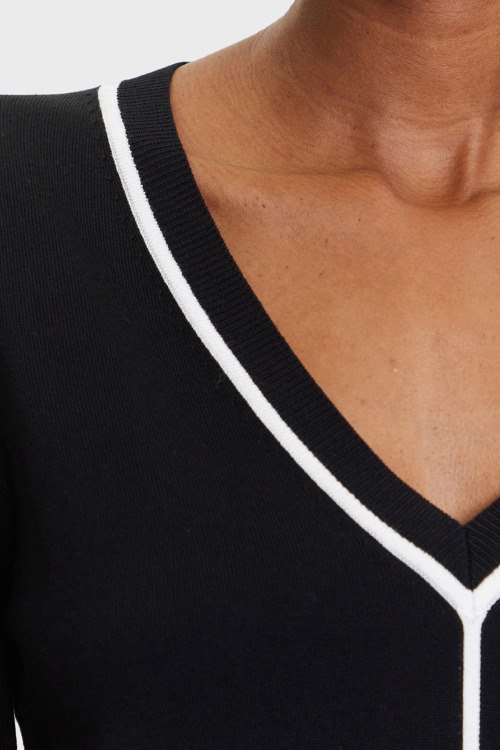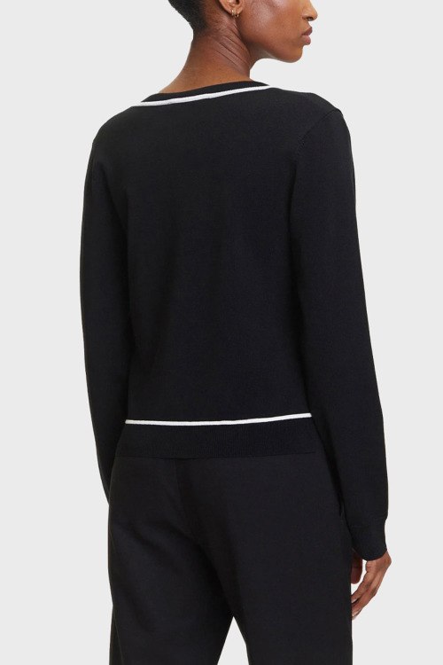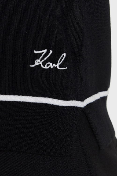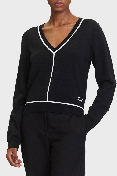 Детали: Женский черный трикотажный пуловер от Karl Lagerfeld (Карл Лагерфельд). Модель с примесью шелка, V-образный вырез, вышитый логотип, классическая длина