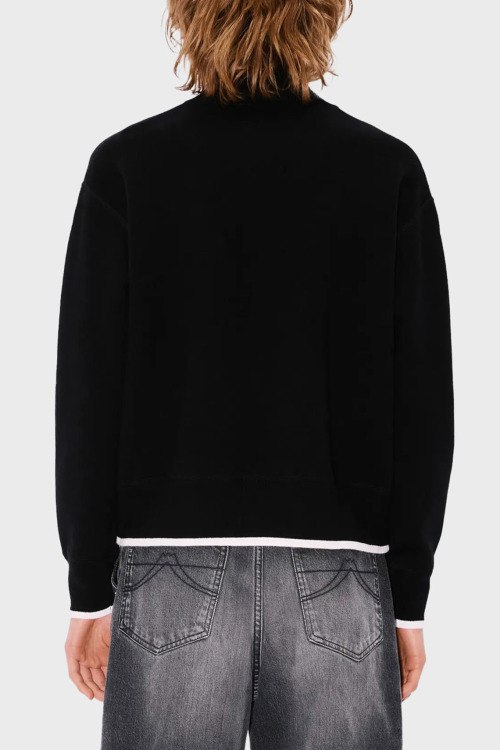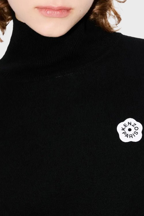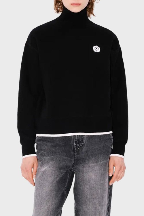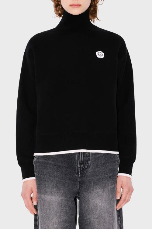 Детали: Женский черный джемпер из шерсти и хлопка от Kenzo (Кензо). Высокий воротник-стойка, длинные рукава, трикотажная резинка на манжетах и по низу изделия, патч-лого на груди