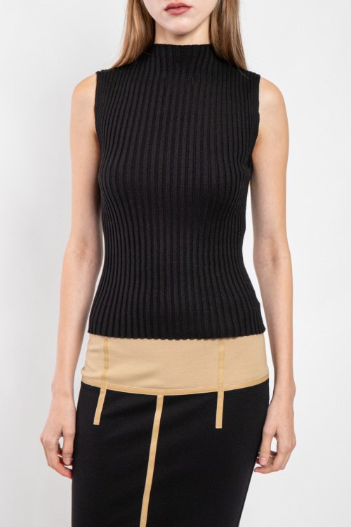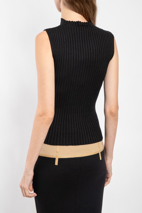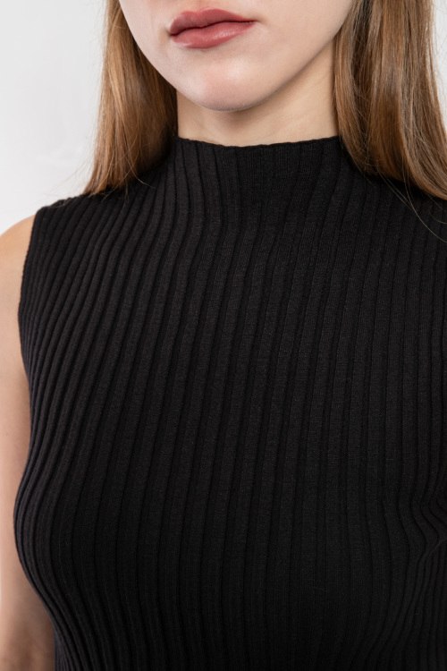 Женский черный джемпер из вискозного микса от Kontatto (Контатто). Классическая длина, дизайн в рубчик, воротник-стойка, без рукавов. Замеры для размера UNI: длина: 52 см, ширина по груди: 22 см, ширина по талии: 17,5 см.