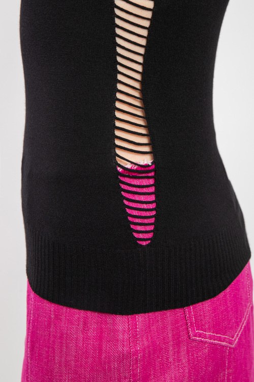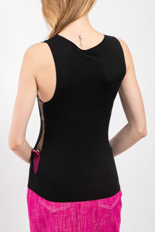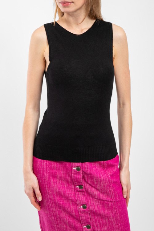Женский черный трикотажный топ от Kontatto (Контатто). Модель без рукавов, круглый вырез горловины, классическая длина. Замеры для размера UNI: длина: 57 см, ширина по груди: 33 см, ширина по талии: 33 см.