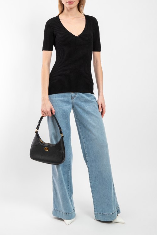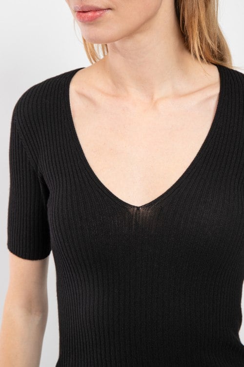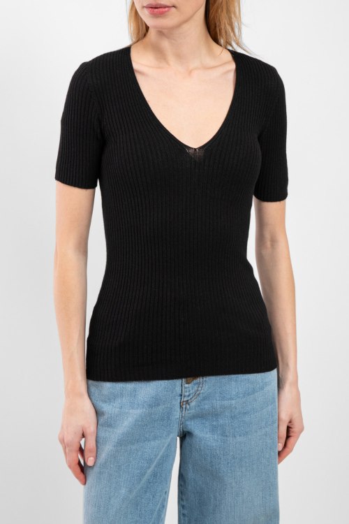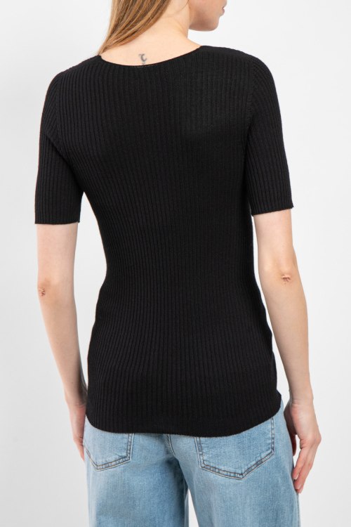 Женский черный трикотажный пуловер от Kontatto (Контатто). Дизайн в рубчик, V-образный вырез, короткий рукав, классическая длина. Замеры для размера UNI: длина: 58 см, ширина по груди 33 см, ширина по талии: 31 см, длина рукава 9 см, ширина рукава: 11 см.