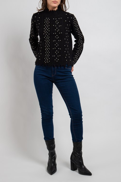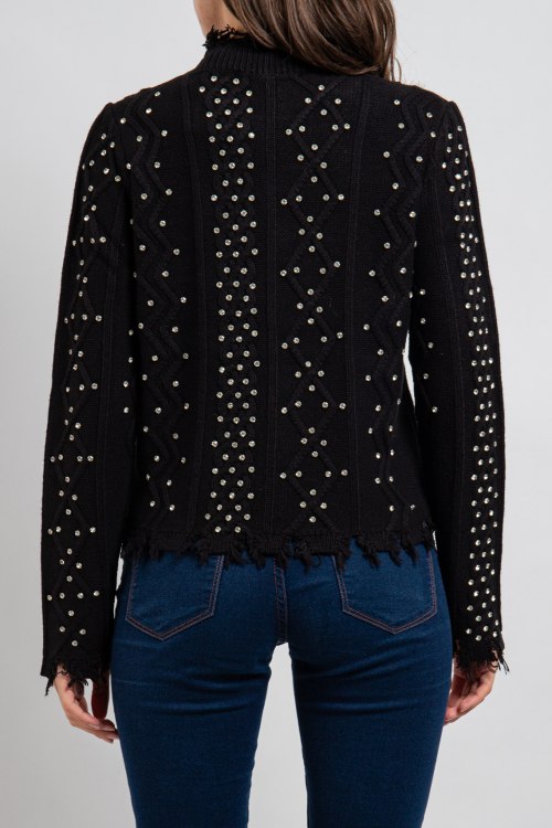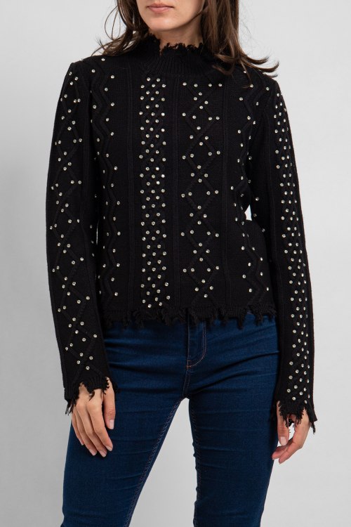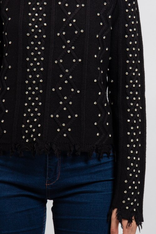 Женский черный джемпер из шерстяного микса от Marco Bologna (Марко Бологна). Отделка камнями по всей поверхности, воротник-стойка, длинный рукав, необработанные нижние края.