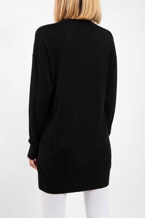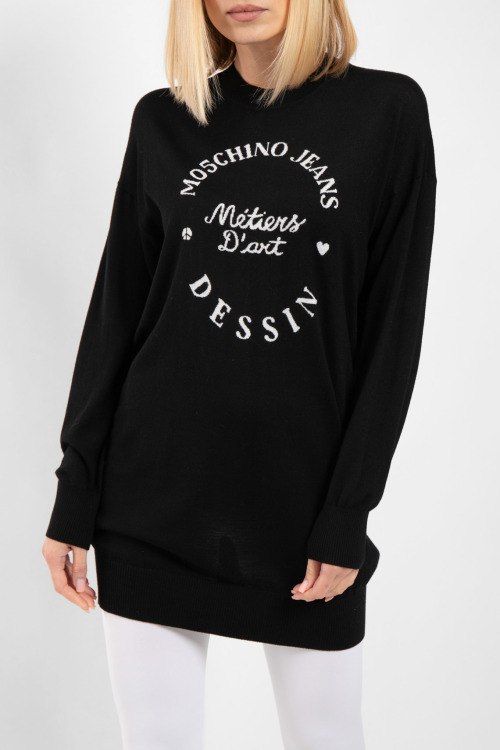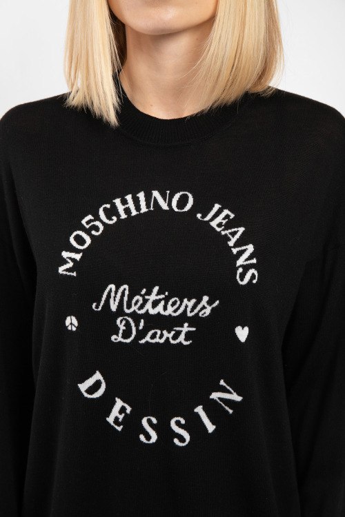 Детали: Женский черный джемпер из шерстяного микса от Moschino (Москино). Удлиненная модель, круглый вырез горловины, длинные рукава, брендированный принт