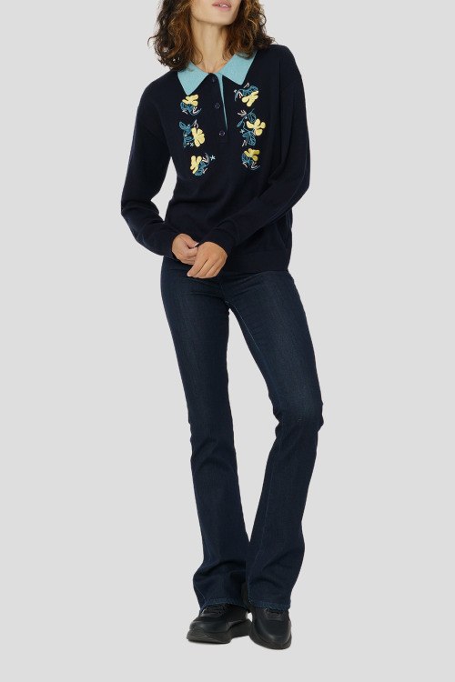 Детали: Женский черный джемпер-поло из шерсти и хлопка от Paul Smith (Пол Смит). Узор цветочной вышивкой, отложной воротник, застежка на три пуговицы, классическая длина, манжеты и нижний край