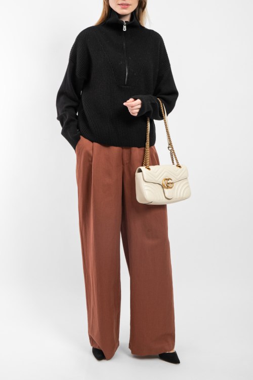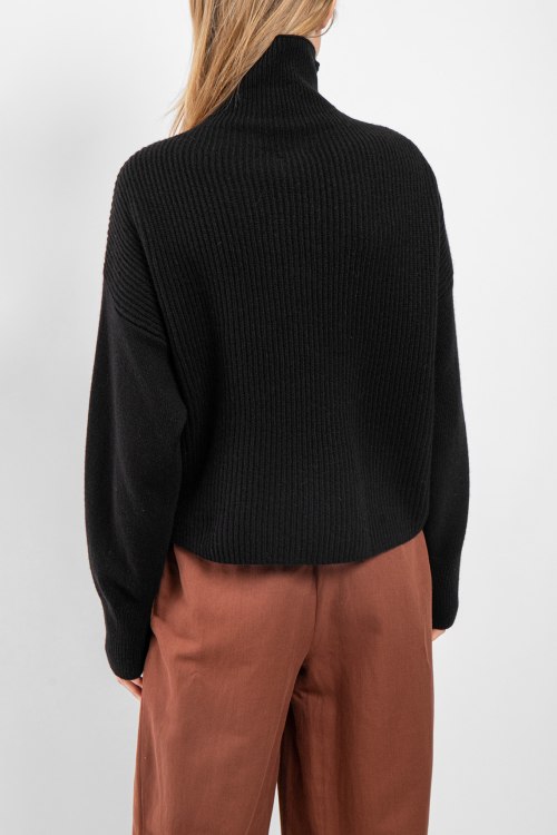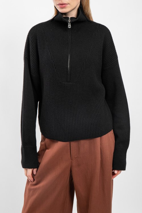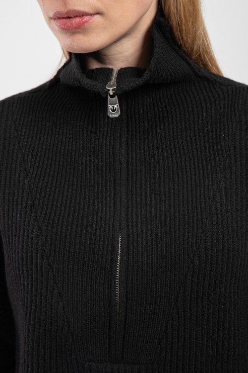 Детали: Женский черный джемпер из шерсти и кашемира от Pinko (Пинко). Высокий воротник-стойка, горловина на молнии, длинные рукава, широкая трикотажная резинка на манжетах и по низу изделия