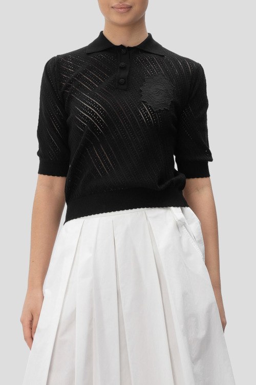 Детали: Женский черный джемпер-поло из хлопка от TWINSET (Твинсет). Перфорированный дизайн, классическая длина, отложной воротник, горловина на пуговицах, короткие рукава, трикотажная резинка по низу изделия