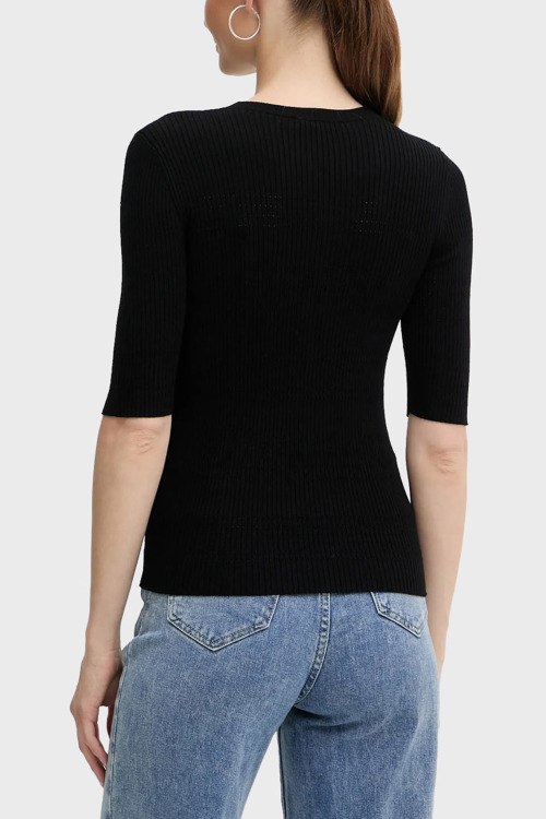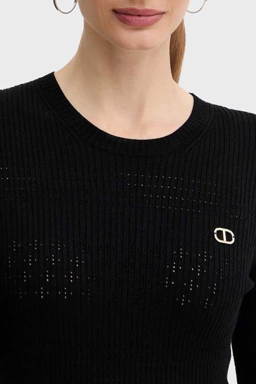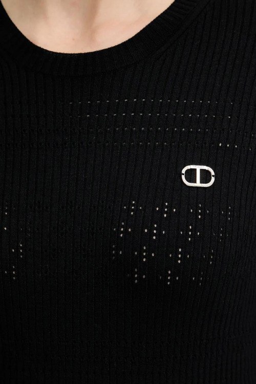 Детали: Женский черный трикотажный джемпер от TWINSET (Твинсет). Значок с логотипом на груди, круглый вырез горловины, короткий рукав, классическая длина
