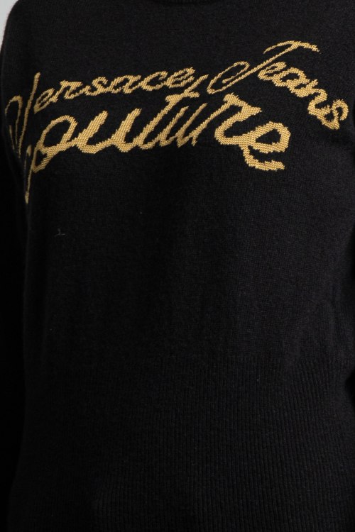 Женский черный джемпер из шерстяного микса от Versace (Версаче). Принт с логотипом на груди, круглый вырез горловины, манжеты и нижний край в рубчик.