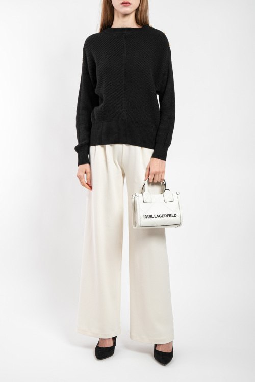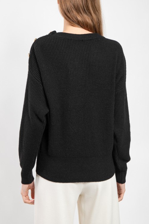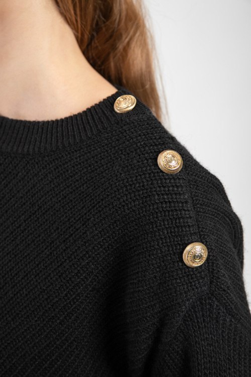 Женский черный джемпер из вискозы и шерсти от Vicolo (Виколо). Классическая длина, круглый вырез горловины, застежка на крупные пуговицы, длинные рукава, широкая резинка на манжетах и по низу изделия. Замеры для размера UNI: длина: 56 см, ширина по груди: 50 см, ширина по талии: 46 см, длина рукава по внутреннему шву: 45,5 см, ширина рукава: 20 см.