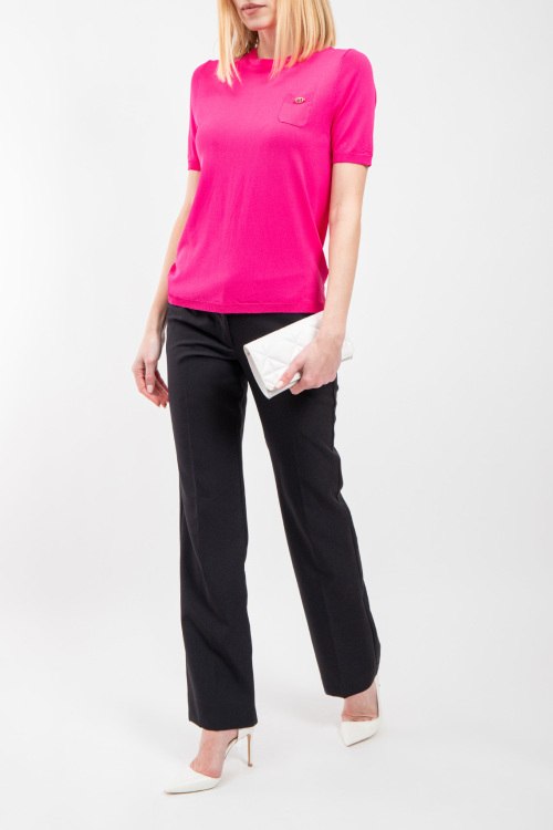 Женский джемпер цвета фуксии из вискозы и полиамида от Roberta Biagi (Роберта Бьяджи). Круглый вырез горловины, короткие рукава, металлический логотип бренда, трикотажная резинка на манжета и по низу изделия. Замеры для размера ll: длина: 63 см, ширина по груди: 44 см, ширина по талии: 44 см, длина рукава по внутреннему шву: 9 см, ширина рукава: 15 см.