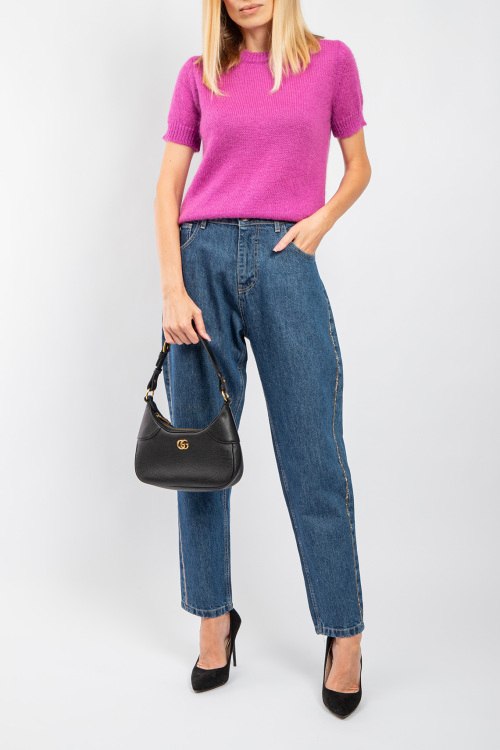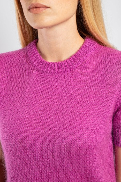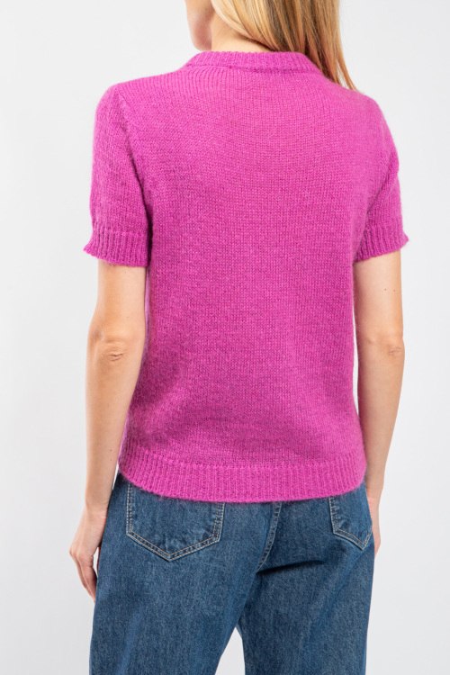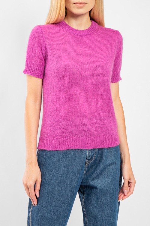 Женский джемпер цвета фуксии из акрила и мохера от Vicolo (Виколо). Классическая вязка, круглый вырез горловины, короткий рукав, классическая длина. Размер вещи на фото: M. Замеры: длина: 57 см, ширина по груди: 46 см, ширина по талии 46 см, ширина рукава 6 см, длина рукава 14 см.