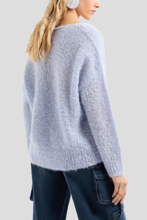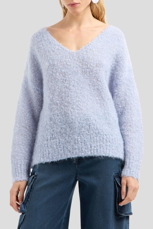 Детали: Женский голубой пуловер из шерсти от Emporio Armani (Эмпорио Армани). V-образный вырез горловины, длинные рукава, приспущенная линия плеча, классическая длина