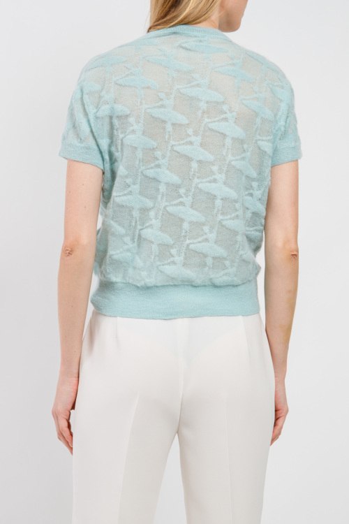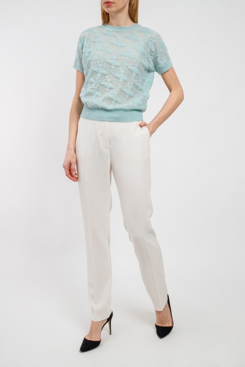 Женский голубой джемпер из мохера, хлопка и шерсти от Max Mara Studio (Макс Мара Студио). Классическая длина, круглый вырез горловины, фактурный узор, короткие рукава, трикотажная резинка на манжетах и по низу изделия.