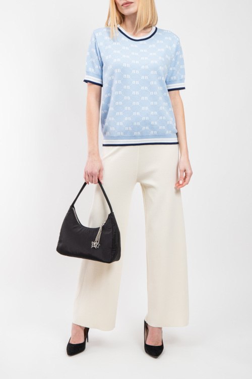 Женский голубой джемпер из вискозы и полиамида от Barbara Alvisi (Барбара Алвиси). Классическая длина, круглый вырез горловины, короткие рукава, модель декорирована монограммой, контрастная окантовка. Замеры для размера L/XL: длина: 60 см, ширина по груди: 51 см, ширина по талии: 51 см длина рукава по внутреннему шву: 10 см, ширина рукава: 18 см.