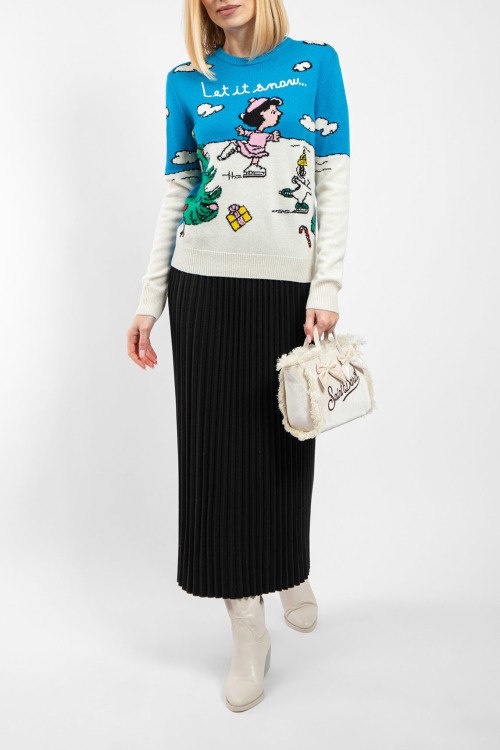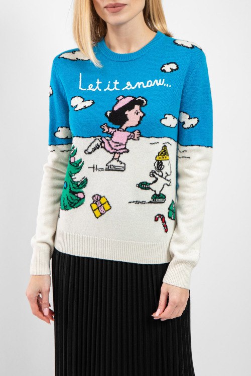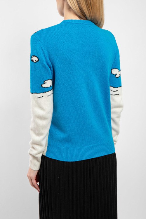 Женский голубой джемпер New Queen C-Lucy skate из шерстяного микса от Mc2 Saint Barth (Mc2 Сент Барт). Дизайн с принтом, круглый вырез горловины, длинные рукава, трикотажная резинка на манжетах.
