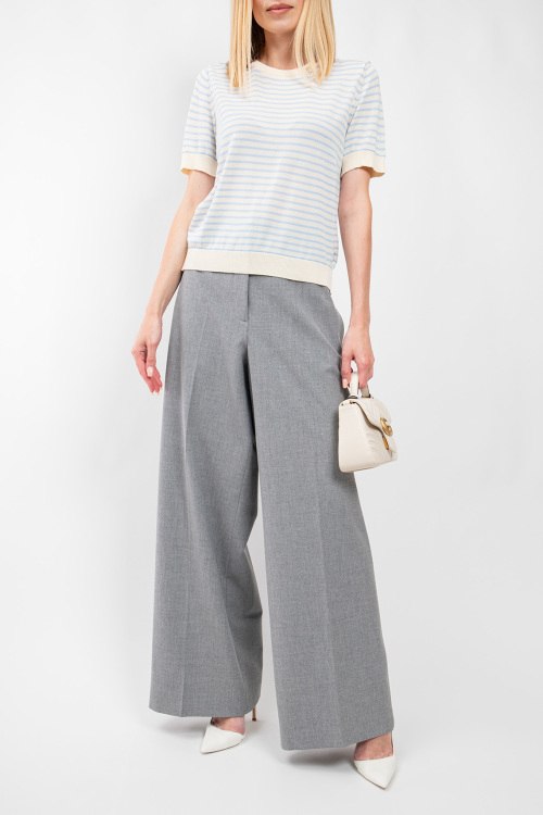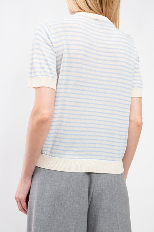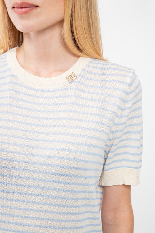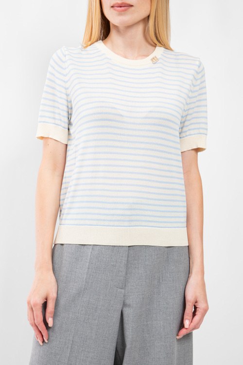 Женский молочно-голубой трикотажный джемпер от Roberta Biagi (Роберта Бьяджи). Полоска по всей поверхности, круглый вырез горловины, значок с логотипом, короткий рукав, классическая длина. Замеры для размера UNI: длина спереди: 57 см, ширина по груди: 49 см, ширина по талии: 48 см, длина рукава: 6,5 см, ширина рукава: 16 см.