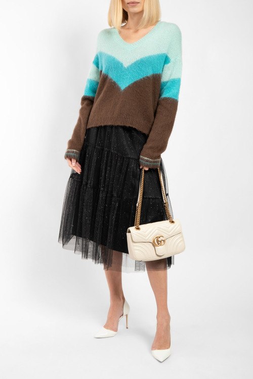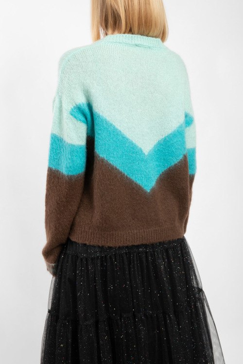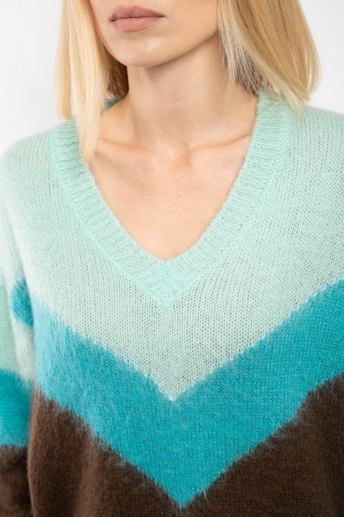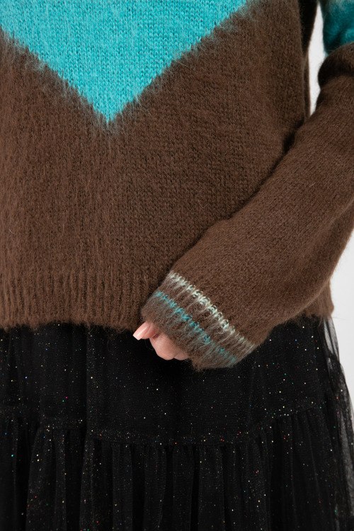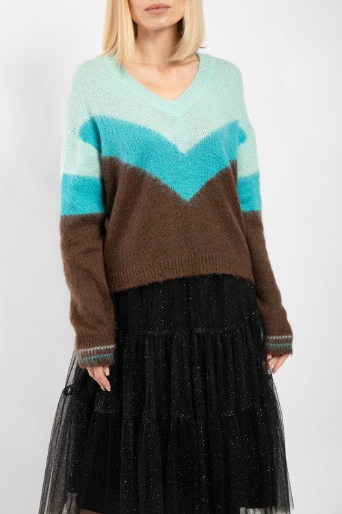 Женский коричнево-голубой джемпер из акрила и мохера от Vicolo (Виколо). V-образный вырез горловины, комбинированный дизайн, длинные рукава, приспущенная линия плеча. Замеры для размера UNI: длина: 54 см, ширина по груди: 59 см, ширина по талии: 54 см, длина рукава по внутреннему шву: 52,5 см, ширина рукава: 18 см.