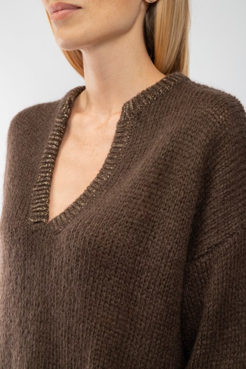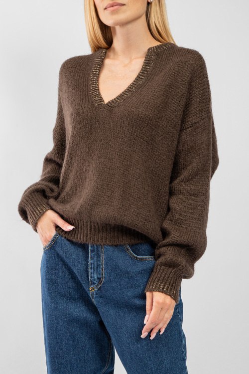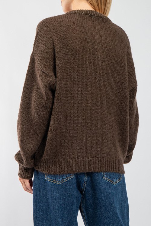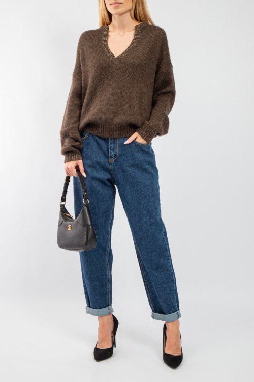 Женский темно-коричневый пуловер из акрила и мохера от Barbara Alvisi (Барбара Алвиси). Классическая вязка, V-образный вырез, спущенная линия плеча, классическая длина. На модели снят размер - 27. Параметры модели: рост 177 см, 88-62-90 см. Замеры: длина: 58 см, ширина по груди: 65 см, ширина по талии 58 см, ширина рукава 18 см, длина рукава 46 см