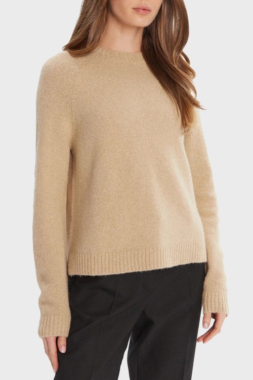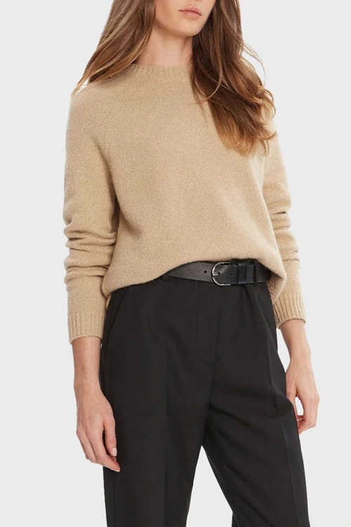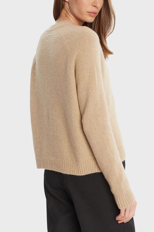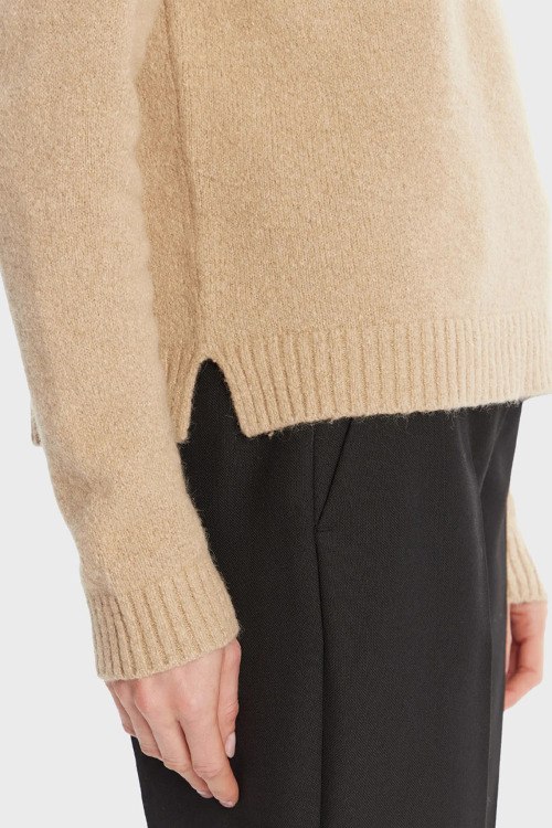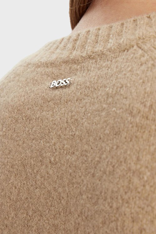 Детали: Женский коричневый джемпер из шерстяного микса от Hugo Boss (Хуго Босс). Круглый вырез горловины, длинные рукава, трикотажаня резинка на манжетах и по низу изделия, по бокам разрезы, металлический логотип бренда