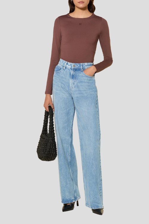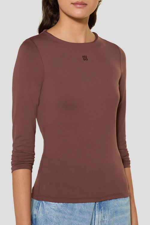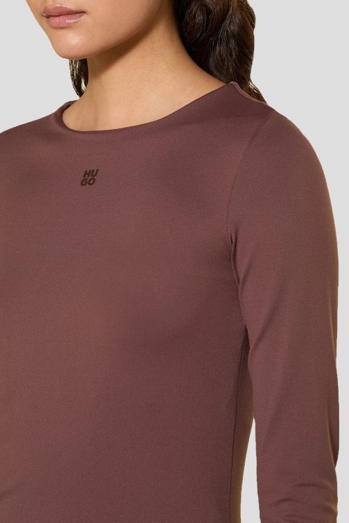 Детали: Женский коричневый лонгслив Dasiia от Hugo by Hugo Boss (Хуго бай Хуго Босс). Логотип на груди, круглый вырез горловины, классическая длина