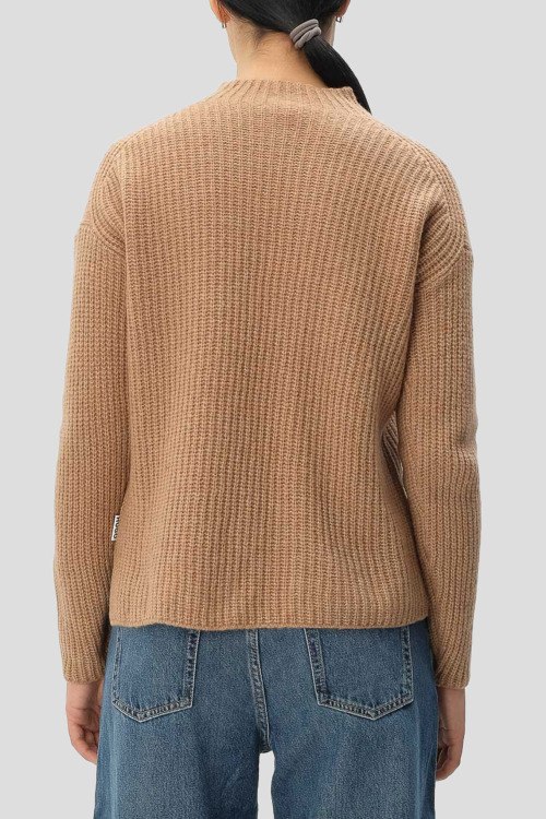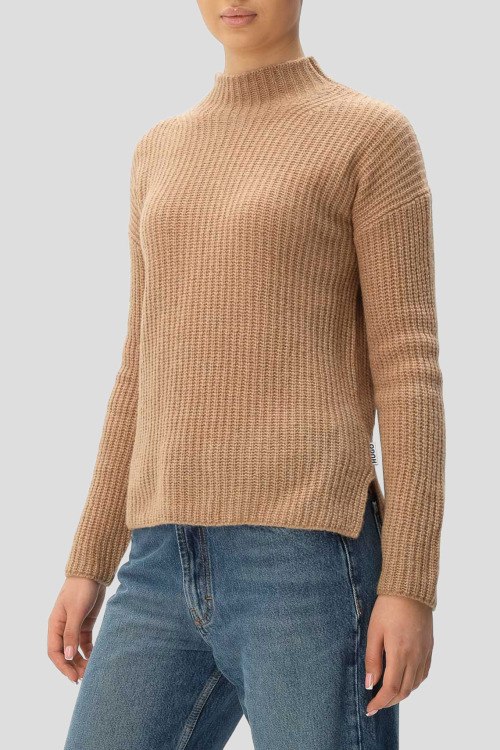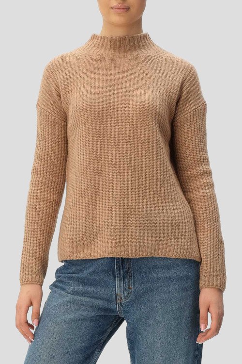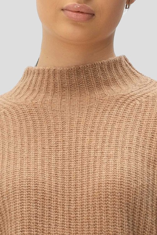 Детали: Женский коричневый джемпер из шерстяного микса от Hugo by Hugo Boss (Хуго бай Хуго Босс). Классическая длина в рубчик, воротник-стойка, длинные рукава, приспущенная линия плеча, по бокам разрез