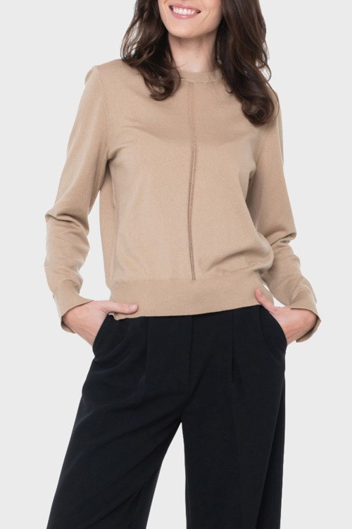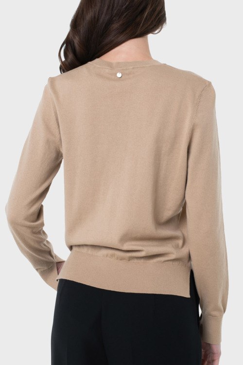 Детали: Женский коричневый джемпер из шерсти и хлопка от Hugo Boss (Хуго Босс). Классическая длина, круглый вырез горловины, длинные рукава, перфорированная вставка, по бокам разрезы