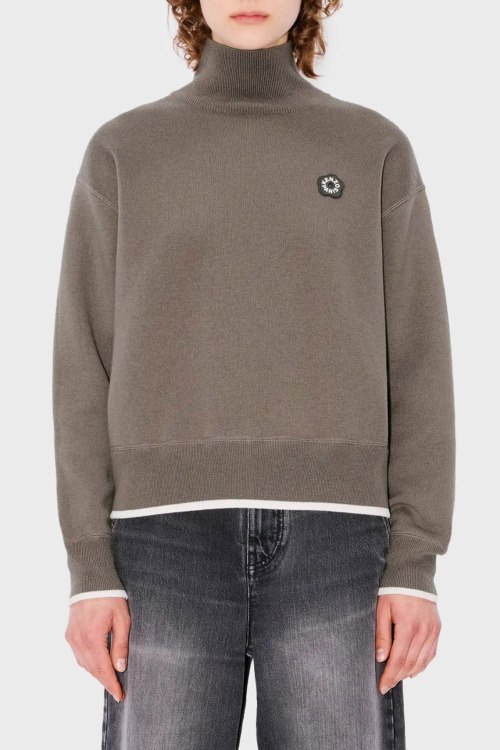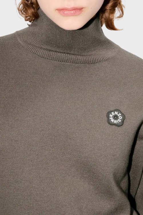 Детали: Женский коричневый джемпер из шерсти и хлопка от Kenzo (Кензо). Высокий воротник-стойка, длинные рукава, трикотажная резинка на манжетах и по низу изделия, патч-лого на груди