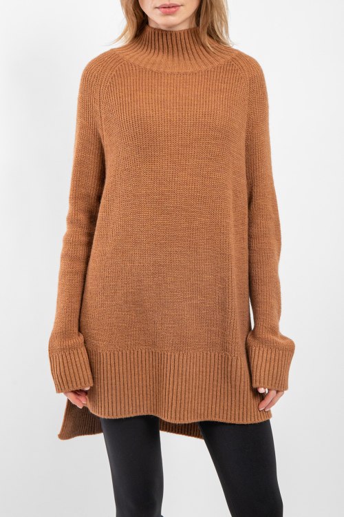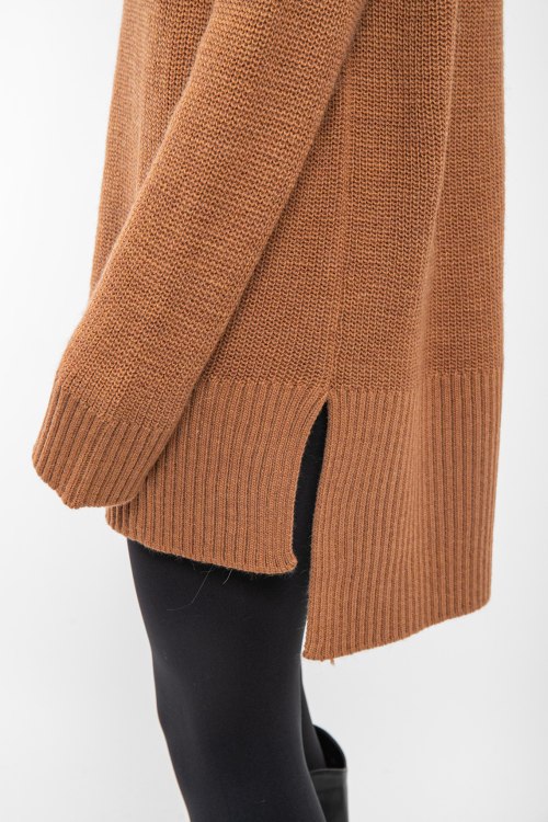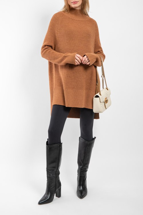 Женский коричневый джемпер из акрила, шерсти и альпака от Kontatto (Контатто). Удлиненная модель, высокий воротник, длинные рукава-реглан, манжеты и низ изделия в рубчик, свободный силуэт. Замеры для размера UNI: Длина: 71 см, ширина по груди: 60 см, ширина по талии : 61 см, ширина по бедрам: 65 см, длина рукава: 40 см, ширина рукава: 15 см.