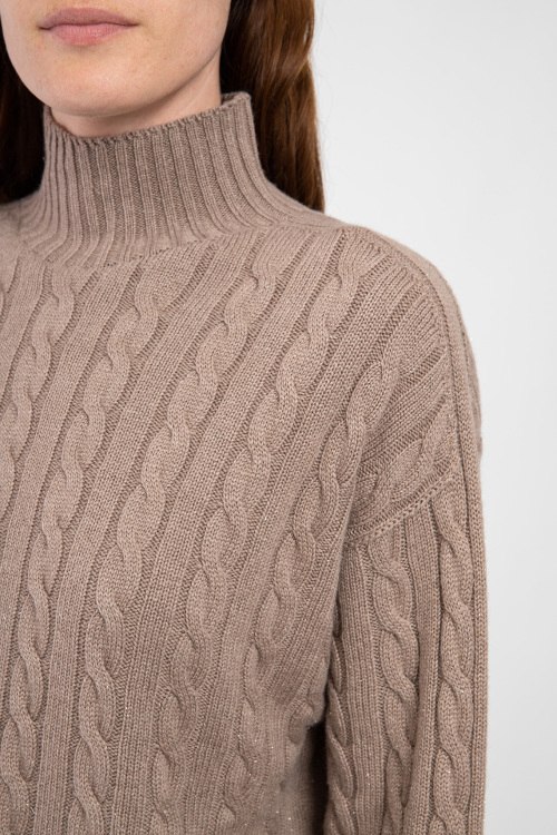 Детали: Женский коричневый джемпер из шерстяного микса от Max Mara Weekend (Макс Мара Викенд). Плетенный дизайн, воротник-стойка, длинные рукава, приспущенная линия плеча, длинные рукава, манжеты с трикотажной резинкой