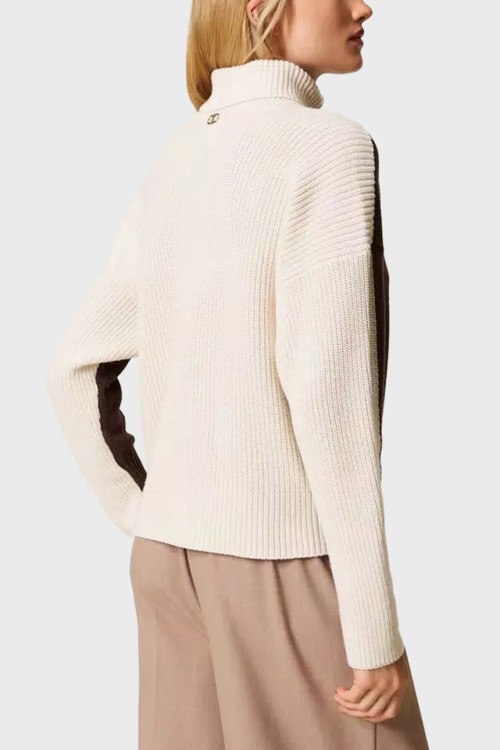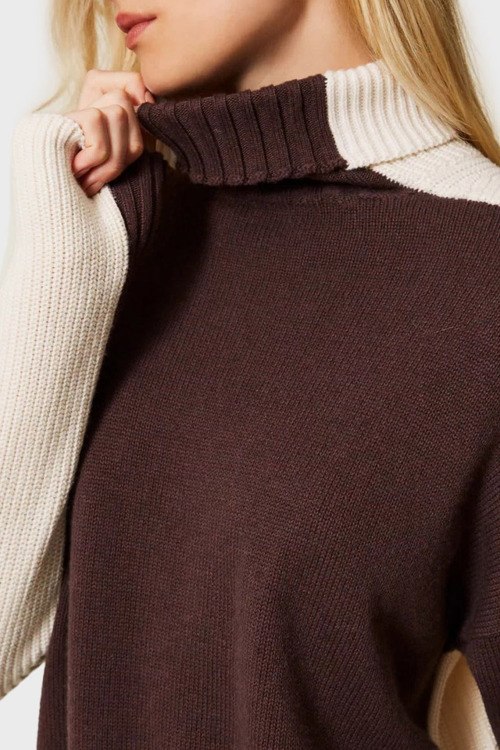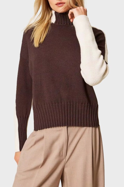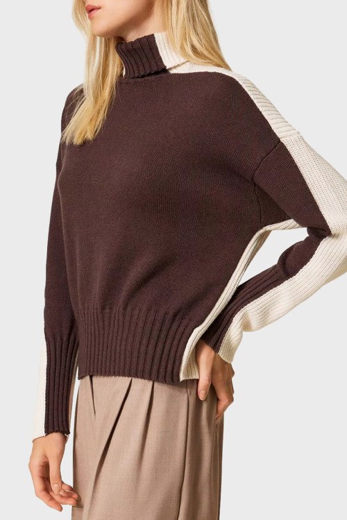 Детали: Женский коричнево-молочный джемпер с шерсти и хлопка от TWINSET (Твинсет). Дизайн колор-блок, высокая горловина, широкие манжеты, классическая длина