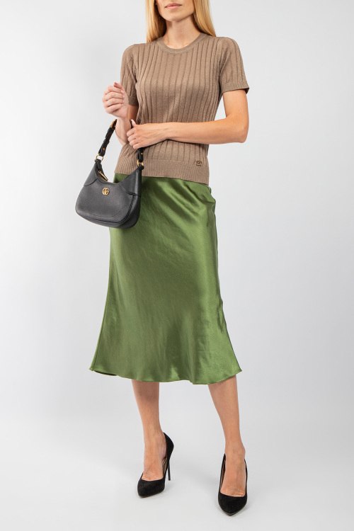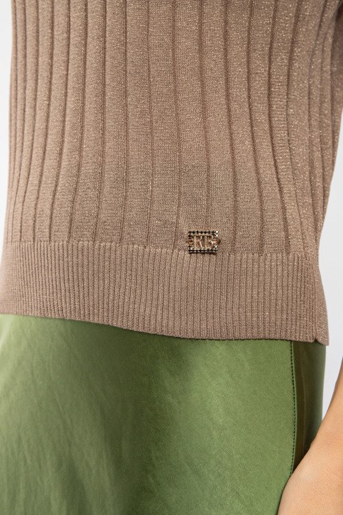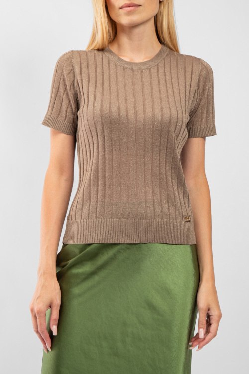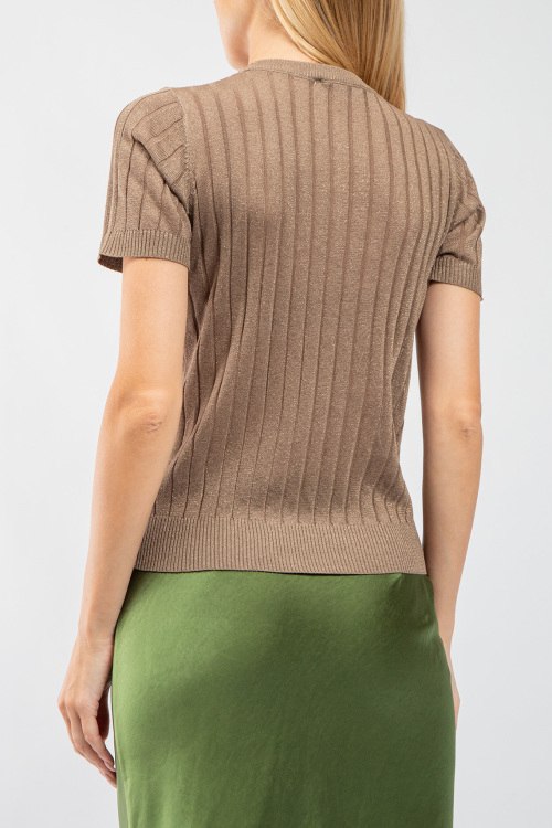 Женский трикотажный джемпер цвета мокко от Roberta Biagi (Роберта Бьяджи). Дизайн с люрексом, нашивка с логотипом, круглый вырез горловины, короткий рукав, классическая длина. На модели снят размер - UNI. Параметры модели: рост 177 см, 88-62-90 см. Замеры: длина: 54,5 см, ширина по груди: 45 см, ширина по талии 44 см, ширина рукава 16 см, длина рукава 6,5 см