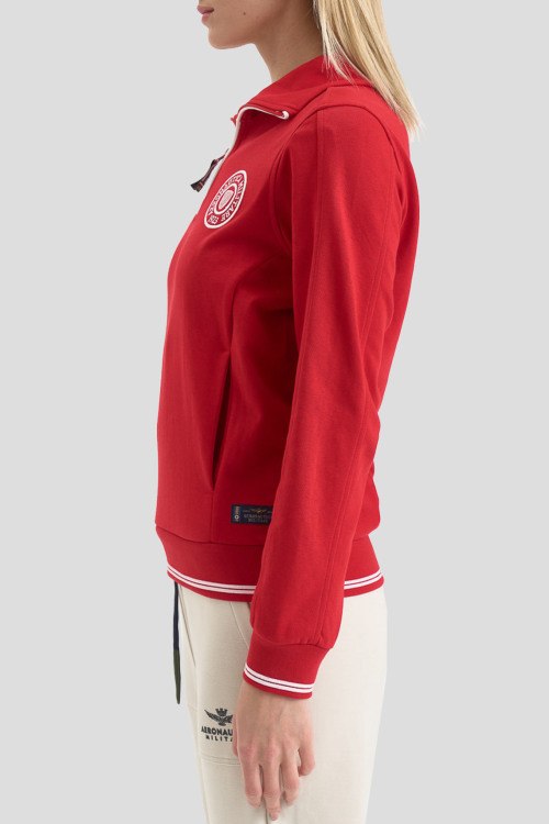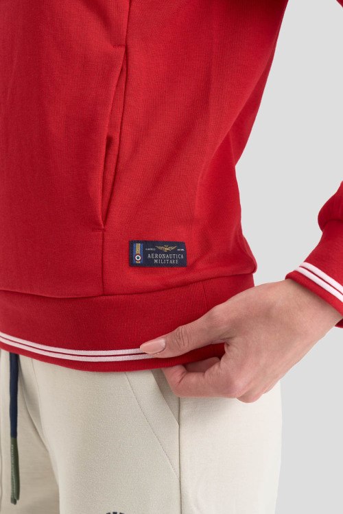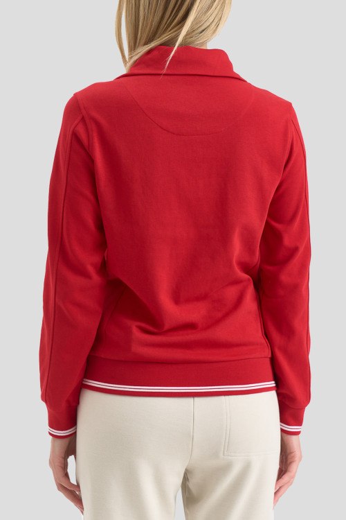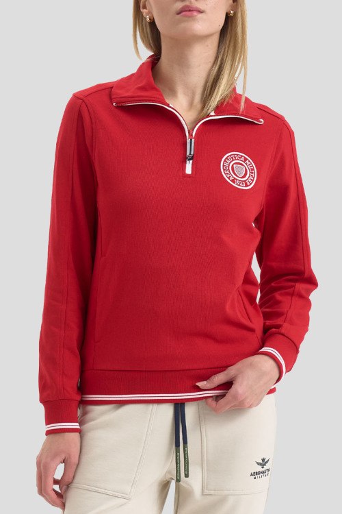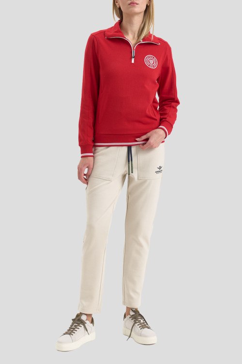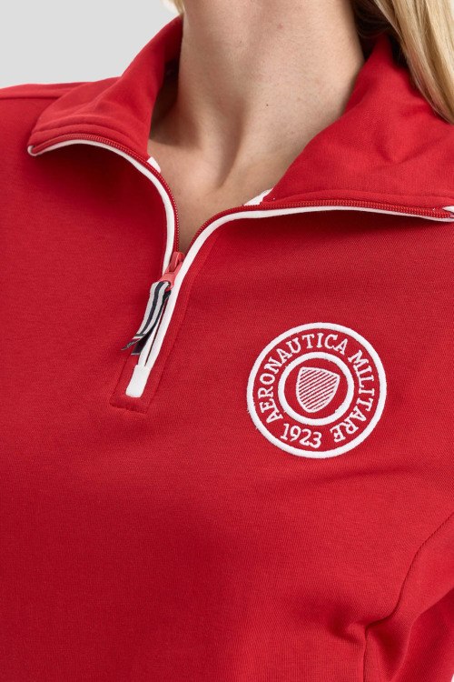 Детали: Женский красный хлопковый джемпер-поло от Aeronautica Militare (Аэронавтика Милитари). Логотип на груди, отложной воротник, застежка-молния, классическая длина, трикотажные манжеты и нижний край