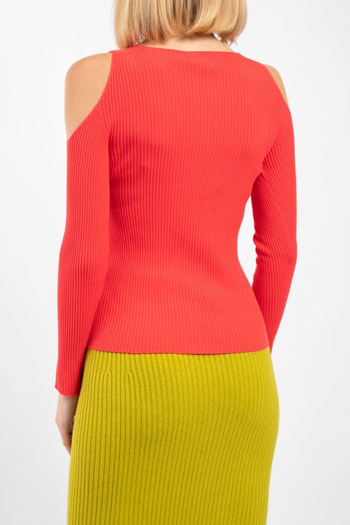 Женский красный пуловер из вискозного микса от Kontatto (Контатто). Облегающий силуэт, V-образный вырез горловины, длинные рукава, открытые плечи. Измерения: длина изделия: 54 см, ширина по груди: 35 см, талия: 32 см, длина рукава по внутреннему шву: 41 см, ширина рукава: 11 см.