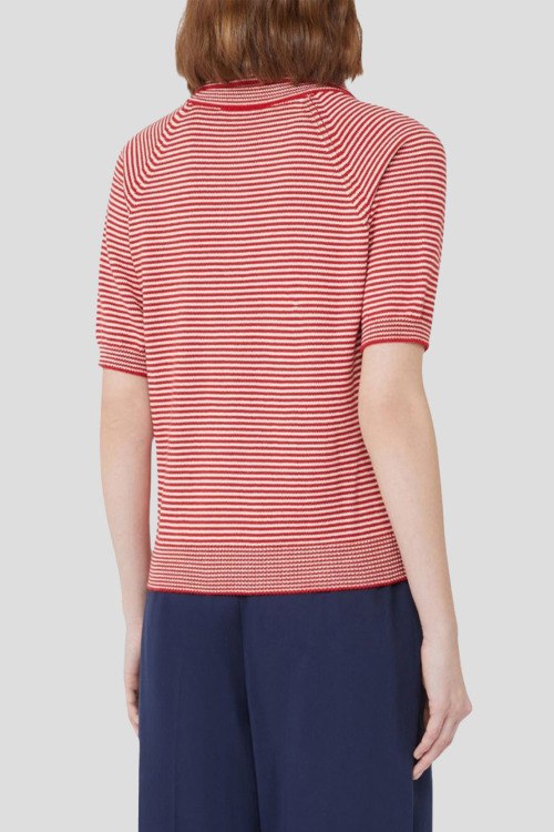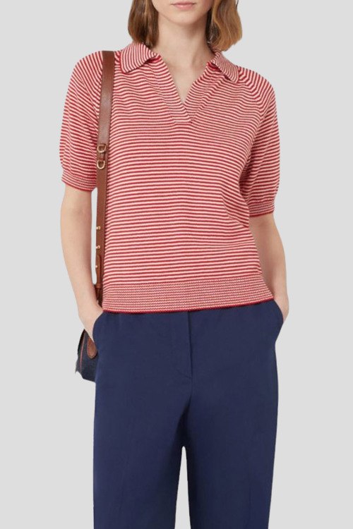 Детали: Женский красный хлопковый джемпер-поло Junior от Max Mara Weekend (Макс Мара Викенд). Полоска по всей поверхности, отложной воротник, V-образный вырез, короткий рукав, классическая длина